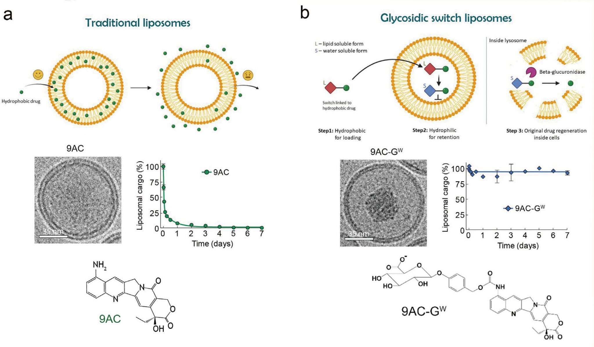 Nanomedicines can improve cancer treatment by decreasing off target toxicities, but current technologies suffer from rapid leakage of drugs from nanocarriers before they reach their cellular targets, resulting in loss of efficacy and increased toxicity. We invented a chemical switch which responds to environmental conditions to alternate between a lipid-soluble state for efficient cargo loading and a water-soluble state for stable retention inside liposomes. A cue-responsive trigger(glycosidic switch) allows release of the molecular cargo at specific cellular sites. Glycosidic switch liposomes can cure mice bearing human breast cancer tumors.